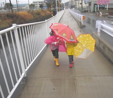 1kmちょっとの道のりに40分掛かるもその間子供達は傘を差して遊べて大満足。