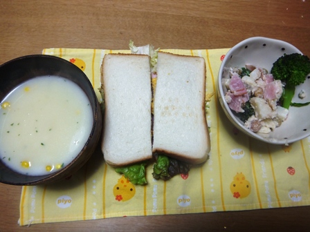 いつもはご飯がメインだけど、本日は息子の遠足があるとかでサンドイッチがメイン。パンは8枚切り。これに食後にリンゴが付きました。
