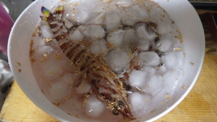 それから足を殻を剥いて行きます。頭は後から唐揚げに、残った箇所も翌朝の味噌汁へと代わります。