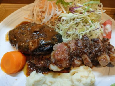 ガッツリハンバーグとステーキが乗ったランチ。