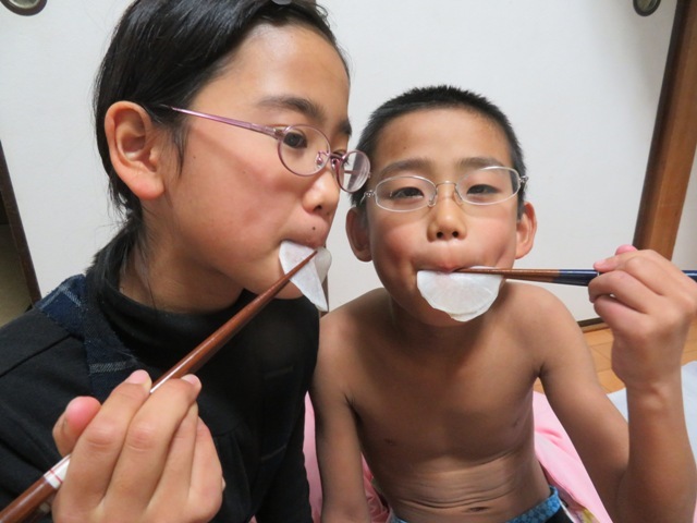 娘が漬けてくれた千枚漬けを食べる二人。二人とも眼鏡ってのも仲良しの証拠か