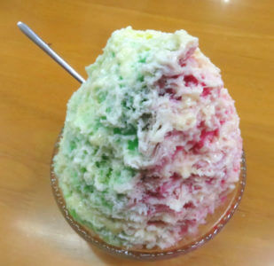 3色ミルクぜんざい、これで380円だったかな。氷がきめ細やかだし、飽きない味だしでペロリと完食。嫁さんも小豆入りのぜんざいを食べて懐かしい味だと興奮してました。
